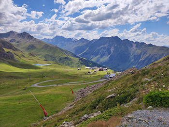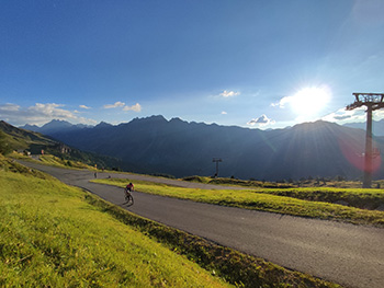 Mein Ziel war klar, die Zeit aus dem Vorjahr verbessern. Allerdings hatte ich beim Aufwärmen ein leichtes Kratzen im Hals, ich war mir unsicher, ob es vom Anfeuern der letzten Tage kommt oder doch eine Erkältung im Anmarsch ist. Also habe ich es auf der knapp 25 km langen Runde durchs Tal erstmal locker angehen lassen und das Halskratzen verschwand auch recht schnell wieder. Zurück in Ischgl ging es dann den steilen Anstieg hoch zur Idalpe. Während des Anstiegs ging mir immer wieder das Rennen vom letzten Jahr durch den Kopf, wo ich kurz vor der Idalpe vom Bike absteigen musste. So kam ich irgendwann genau an diese Stelle. Und ich merkte: Meine Beine fühlen sich noch sehr frisch an, da geht noch was.