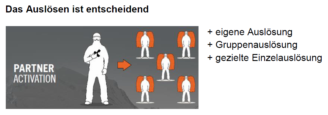 Mit der Partnerauslösung läutet P.RIDE eine neue Ära in der Eigen- und Kameradenrettung ein. Die serienmäßige Funkverbindung zu den Partnern ermöglicht erstmals, aktiv Partner zu schützen, noch bevor es zu einer Verschüttung kommt. Mit dem gleichzeitigen Aufklappen des Auslösegriffs synchronisieren sich die Partner automatisch. Die Partnerauslösung ist aktiv – ohne komplizierte Programmierung. Im Gruppenmodus kann der Träger des Rucksacks gleichzeitig den eigenen und die Airbags aller anderen Gruppenmitglieder auslösen. Wird ein Hang einzeln befahren, können einer oder mehrere Wintersportler vorübergehend in den Einzelfahrermodus wechseln. In einer kritischen Situation ist so die gezielte Fernauslösung einzelner Airbags möglich