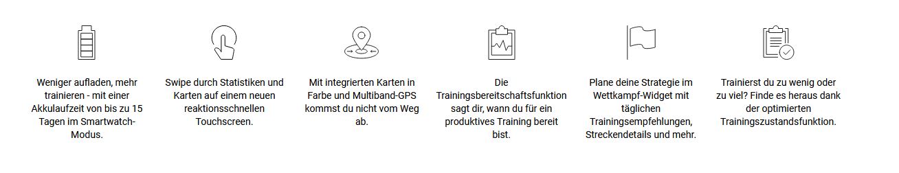 Länger, schneller, besser – diese GPS-Lauf- und Triathlonuhr liefert dir mit vorinstallierten Karten, Solar-Ladelinse und dem neuen Feature Trainingsbereitschaft alles, was du für neue sportliche Höchstleistungen brauchst. Jeden Tag. In jedem Wettkampf.