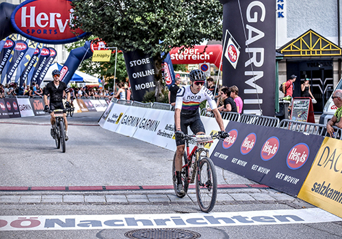 Anschließend folgte eine über drei Kilometer lange und abwechslungsreiche Abfahrt. Zuerst eine nur mäßige fallende Passage mit moosverwachsenen, nassen Wurzeln neben dem Sulzbach, danach ein Steilstück durch ein Steinfeld und zum Abschluss ging es mit Highspeed entlang eines Abhangs unterhalb der Gschwendtalm zurück Richtung Bad Ischl. Am Streckenrand waren neben zahlreichen Freiwilligen der Bergrettung auch einige Teilnehmer*innen, die mit Reifenschäden zum Anhalten gezwungen wurden. Sowohl Marco, Dominik als auch ich waren dank Nora Pure Sports aber wieder mit Top-Material am Start und kamen defektfrei durch das gesamte Rennen. Nun ging es über einen über 20% steilen Anstieg in den zweiten Teil der Strecke. Hierbei merkte ich die fehlenden Trainingsstunden der letzten Wochen. Obwohl ich mich aufgrund der Temperaturen jenseits der 30 Grad mit genügend Flüssigkeit und Kohlehydraten versorgte, waren meine Oberschenkel bald nicht mehr in der Lage, noch genug Kraft auf die Pedale zu bringen, um diese Anstiege im Renntempo zu bewältigen. Dabei verlor ich einige Plätze, bis ich den letzten Gipfel des Tages, die Hütteneckalm, erreichte. Nun standen neben kurzen und giftigen Anstiegen vor allem der Downhill über die Ewige Wand auf dem Programm. Dieser liefert neben rasanten Abfahrten und kniehohen Steinstufen jedes Jahrvor allem die fesselndsten Bilder der Fahrer*innen. Dabei geht es durch einen höchstens zwei Meter hohen Steintunnel bis vor zum Felsvorsprung, wo man lediglich durch ein altes, rostiges Geländer von einem über 100 Meter abfallenden Abhang getrennt ist. Für den sich dort bietenden atemberaubenden Blick über Bad Goisern und den angrenzenden Hallstädter See hat man im Rennen allerdings kaum Zeit – zu fokussiert ist man, die letzte Abfahrt noch schnell und sturzfrei zu bewältigen, nachdem die bereits absolvierten 2200 Höhenmeter die Energiereserven fast vollständig geleert hatten.