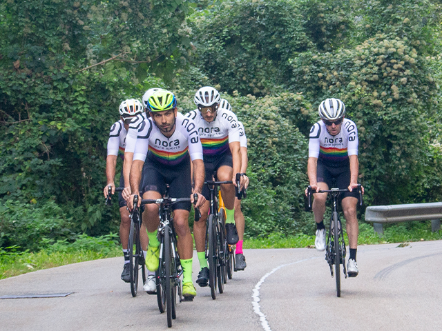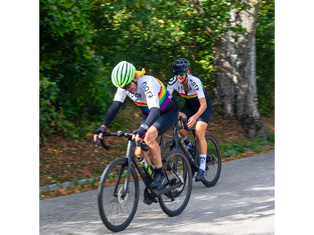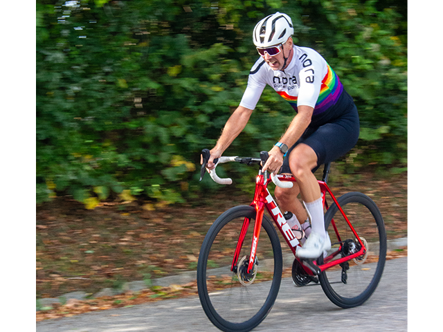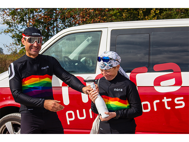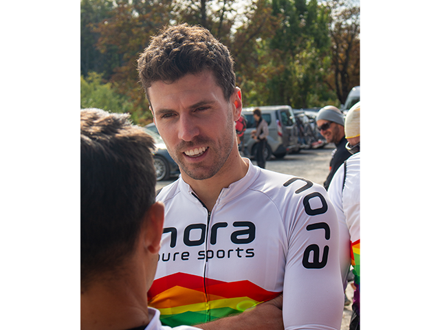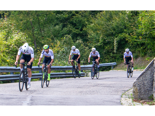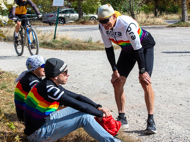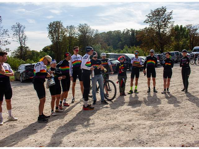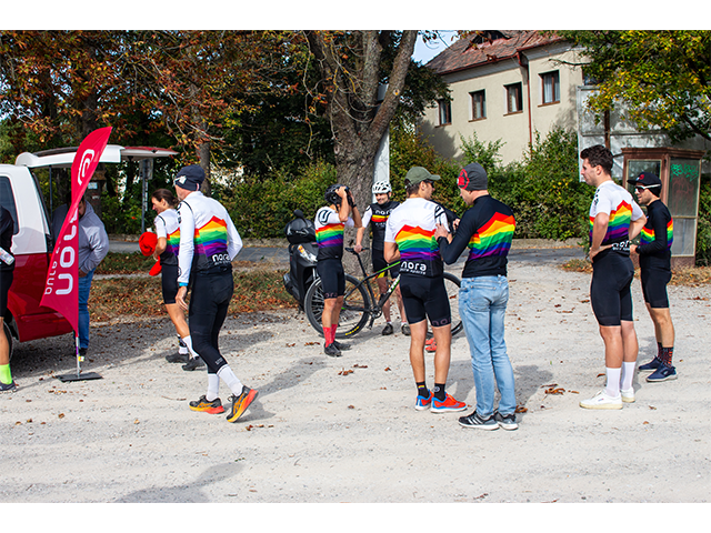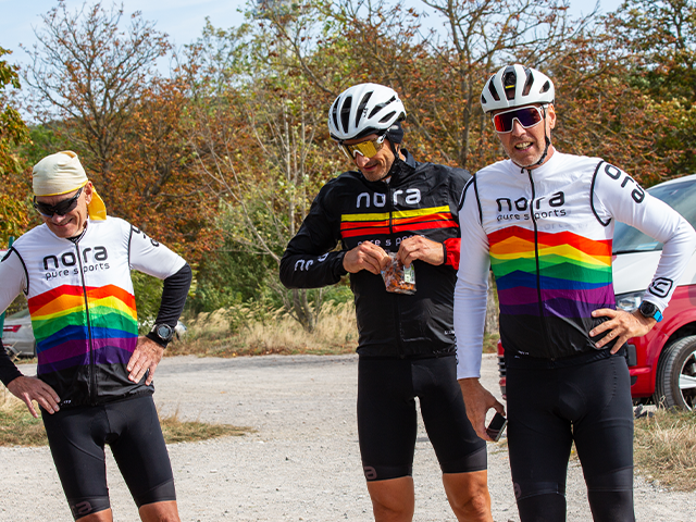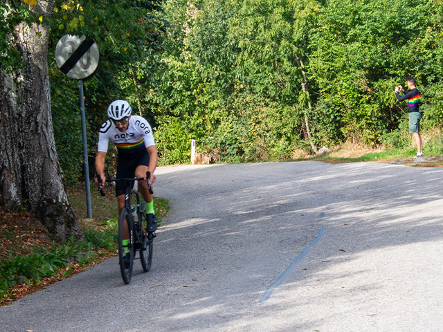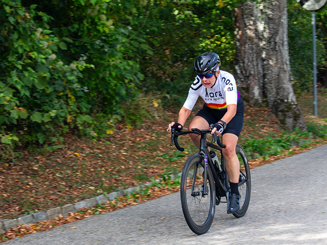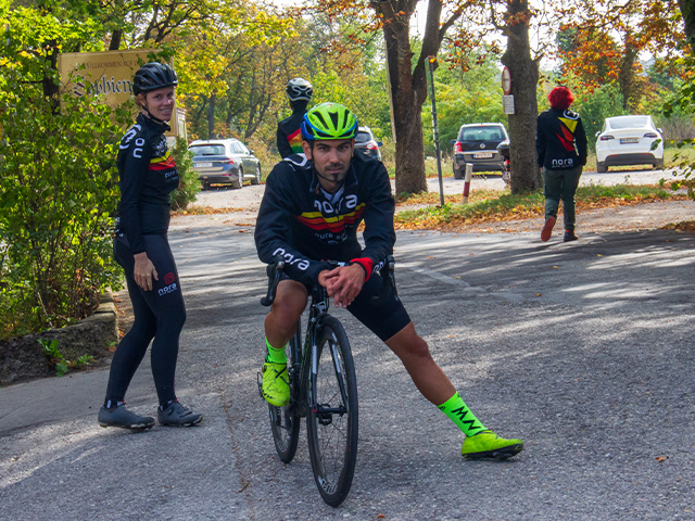 Wie schon erwähnt, machte den Start das Rennrad-Event. Um 11.05 startete der gesamte Trupp vor dem Gasthof Reinwald in Mauerbach, am Fuße der Sophienalpe. 11 Teamfahrer gingen an den gemeinsamen Start. Zu Beginn der Strecke waren alle Fahrer:Innen noch ziemlich gleichauf; auf den eher welligen ersten Kilometern war es eine kleine Gruppe, die die Führung übernahm. Marco Conter startete einen kurzen „Täuschangriff“, aber sonst war die erste Phase des Rennens ziemlich ausgeglichen.