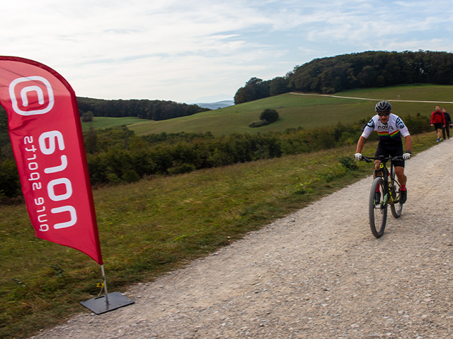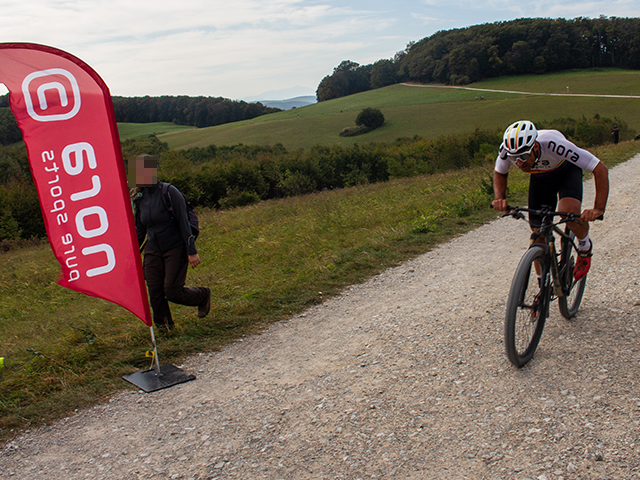 Männer vertreten. Zu bewältigen waren 4,5 Kilometer und 220 Höhenmeter am Stück. Vom Ziel aus hatte man einen tollen Blick auf die letzten (circa) 500 Meter der Strecke, und ein Fahrer mit weißem Helm kam als Erster über die Kuppe. Die begeisterten Teammitglieder, die nicht in der MTB-Wertung gestartet waren, brauchten nicht lange um zu erkennen wer es war: Chrisi Schwab war auch hier den anderen