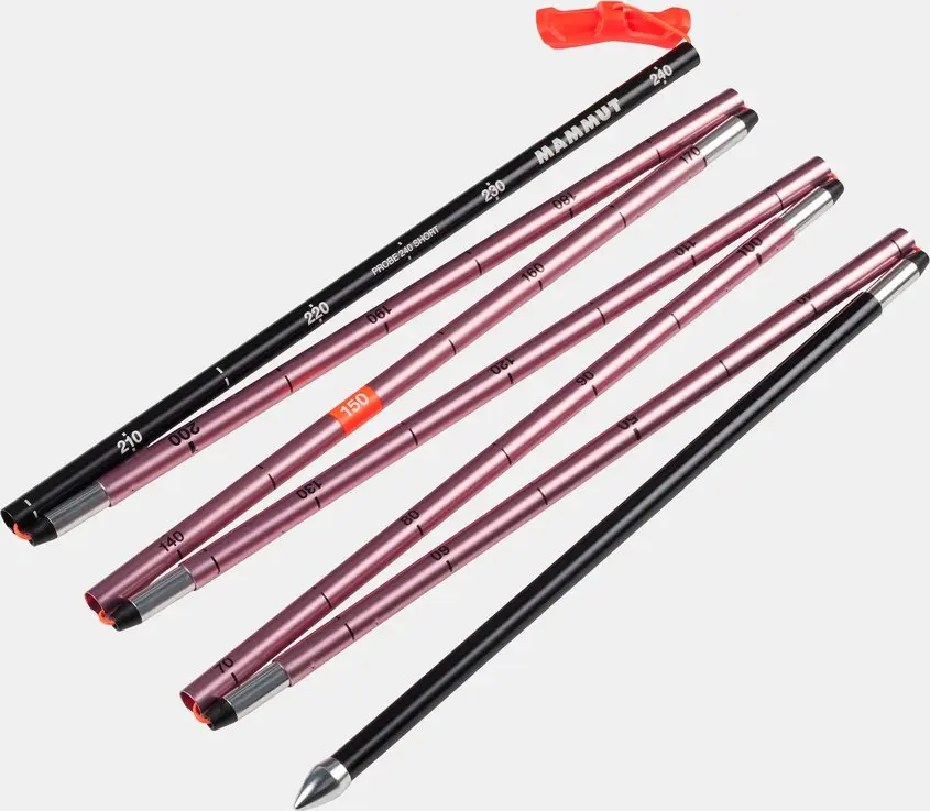Schnell zusammenzubauen, kompakt und einfach zu handhaben: In den fordendsten Situationen punktet die Probe 240 Short mit Einfachheit. Bei der Entwicklung unserer Sonden wurde auf jedes Detail geachtet, damit sie ihren Zweck erfüllen: das Ziel finden. Die stabile, leichte Sonde aus robustem Aluminium hat ein handschuhtaugliches, zugfestes Teleskopverschluss-System und einen ergonomischen Griff. Mit diesem lässt sich die Probe 240 Short schnell und zuverlässig aufspannen. Das verbesserte visuelle Tiefenleitsystem gibt dir immer die richtigen Informationen zur Hand. Die geformte Spitze durchdringt verdichteten Lawinenschnee effizient – so sparst du Kraft beim Sondieren. Zusammengeklappt passt die kompakte Sonde optimal in einen kleinen Skitourenrucksack. Im Notfall zählt jede Sekunde. Deshalb erfüllt unsere Lawinenausrüstung die höchstmöglichen Sicherheitsstandards. Alle Mammut-Lawinensonden sind UIAA-zertifiziert und daher effizient bei der Rettung, langlebig und ergonomisch im Handling. Diese Sonde mit einer Gesamtlänge von 240 cm misst zusammengeklappt 38 cm. Dabei ist eine Sondenhülle mit integriertem Notfallplan.