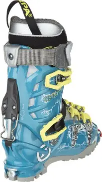 Scarpa's Gea 1. 0 Women's Alpine Touring Boot has been the most popular ladies' AT boot on the market for years, but this year's version has been tweaked to ski better, weigh less, and be more comfortable than ever before. At just three pounds, it's the lightest all-around AT boot in Scarpa's line, but with plenty of downhill performance to fulfill your need for speed and hunger for all things steep and deep. It has a comfortable 101mm last that won't crush your foot, and a heat-moldable Intuition Pro Flex G Women's liner to give you the perfect fit, so you won't want to amputate both your feet at the end of an all-day tour. This year Scarpa's also introduced the new Mirage Pro ski/walk mechanism, which maintains the Gea's 39 range of cuff motion but adds considerable downhill performance through the addition of two locking pins and the stiffer Evo V-Frame cuff. The Gea's shell is made of eco-friendly Pebax Rnew, and the Axial Alpine tongue, which attaches at the toe and pivots to the side for easy on and off, is made of stiff Pebax to help give the boot a smooth, progressive 100 flex. The tongue design also helps the boot buckle more smoothly along the forefoot, letting you dial in the perfect volume for a comfortable pinch- and slop-free fit. Scarpa's beefed up the power strap and given it a glove-friendly cut-out for easy tightening, and hooked the Gea up with magnesium buckles, a wiregate Tour-Lock clasp to keep your top buckle in place even when it's not locked down, and a super-grippy Vibram Cayman sole to make short work of rocks, icy traverse, and exposed ridge walks.