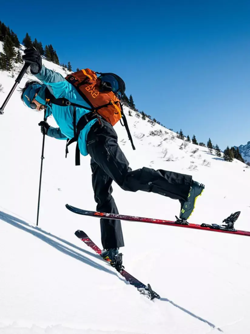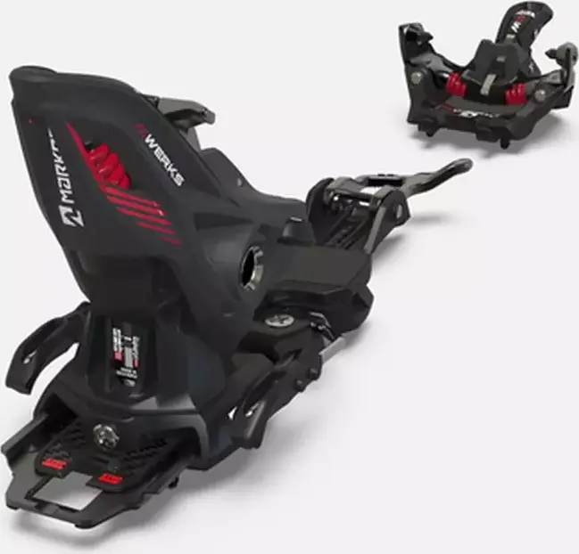 Die State-of-the-Art Performance-Pin-Bindung von MARKER mit einem Z-Wert bis 12. Die Kingpin M-Werks 12 mit Carbon-verstärkter Ferse wiegt inklusive Bremse nur 655 g und bietet dank der Ausstattungsmerkmale wie XXL Power Transmitter oder ergonomisch geformter Aufstiegshilfe bergauf und bergab bestmögliche Leistung. Die sehr steife, ebenfalls Carbon-verstärkte Front mit ISI-Vorderbacken verbessert den Einstiegskomfort, da dank breiter Standfläche mit integriertem Anschlag der Schuh automatisch korrekt positioniert und ausgerichtet wird. Im Anschluss lässt die optimierte Kinematik der Pin-Hebel die Pins schon bei sehr geringem Druck zuschnappen.