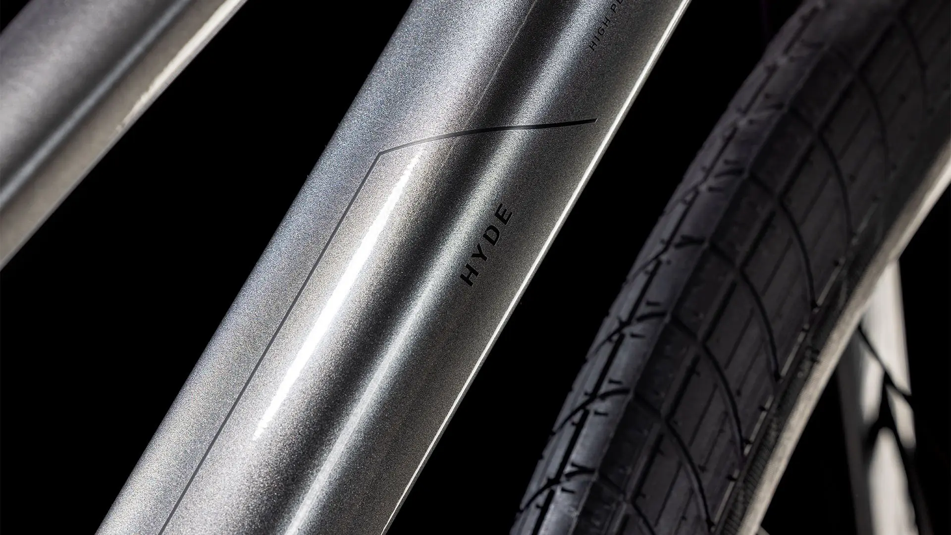 Sieht ein bisschen so aus wie ein 29 Zoll Mountainbike – ist es aber nicht! Der Trapezrahmen des Hyde besteht aus doppelt konifizierten Aluminiumrohrsätzen, die ihm eine stabile und zugleich leichte und agile Struktur geben. Ein überaus formschön ins Design integrierter Gepäckträger und Aufnahmepunkte für Schutzbleche sorgen für die nötige Vielseitigkeit und Flexibilität. Außerdem kann eine Wasserflasche mitfahren, falls die Tour am Wochenende doch mal länger dauert als geplant. Eine leichte Vollcarbongabel vollendet das Set-up – für höchste Lenkpräzision und einen eleganten Look.
