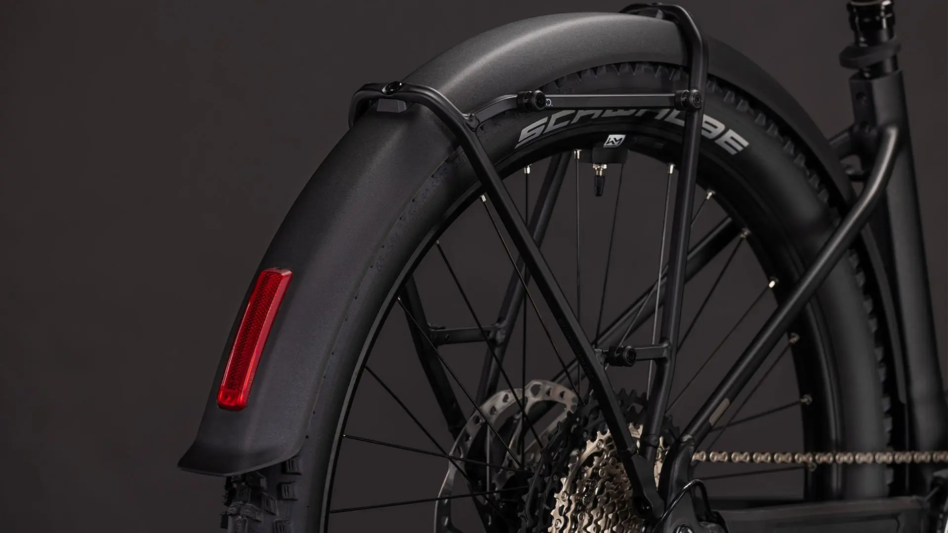 Was beim Reaction Hybrid FE direkt ins Auge sticht, ist sein ästhetisch ansprechendes, praktisches Zubehör, bestehend aus Schutzblechen, Lichtern, Gepäckträger und Seitenständer. Doch das ist noch ...
