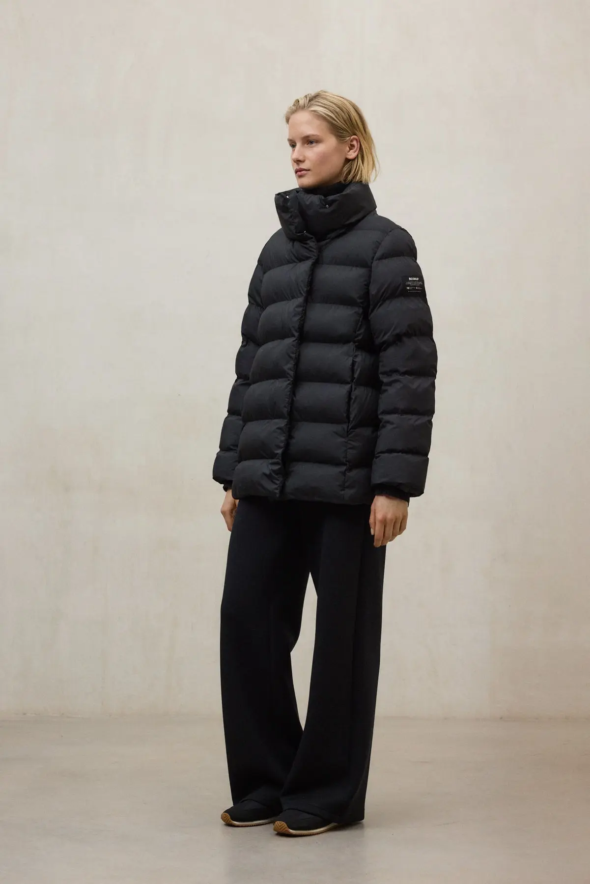 Relaxed design with stand-up collar and concealed seam pockets for a refined and functional figure.