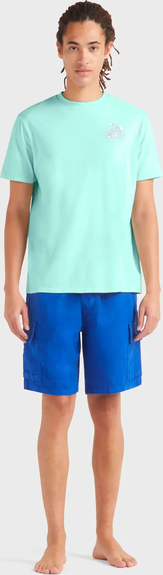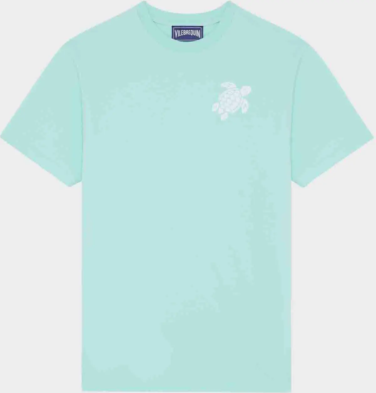 Chain-stitched turtle embroidery in contrasting thread on the left chest