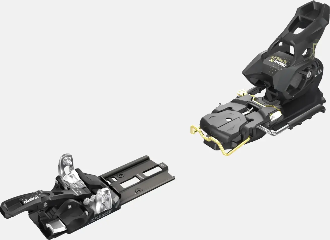 Die neue Attack HYBRID 14 MN/PT kombiniert ultimative Aufstiegsperformance mit kompromisslosen Abfahrtseigenschaften. Ganz einfach und ohne Werkzeug wird die Pin-Backe gegen die Alpineinheit getauscht und die Attack HYBRID verwandelt sich von einer vollwertigen Tourenbindung in eine leistungsstarke Freeride-Bindung, mit mehr Sicherheit und Leistung für jede Abfahrt und jedes Gelände. Mit DIN 4-14, einer 4 mm-Sprengung, der Fersen-Standhöhe von 32 mm und einem, dank 30% Carbon Anteil, angenehm leichten Aufstiegsgewicht von 865g, ist die Attack Hybrid optimal funktional. In der alpinen Abfahrtsfunktion bringt das Modell nur 1115g auf die Piste.