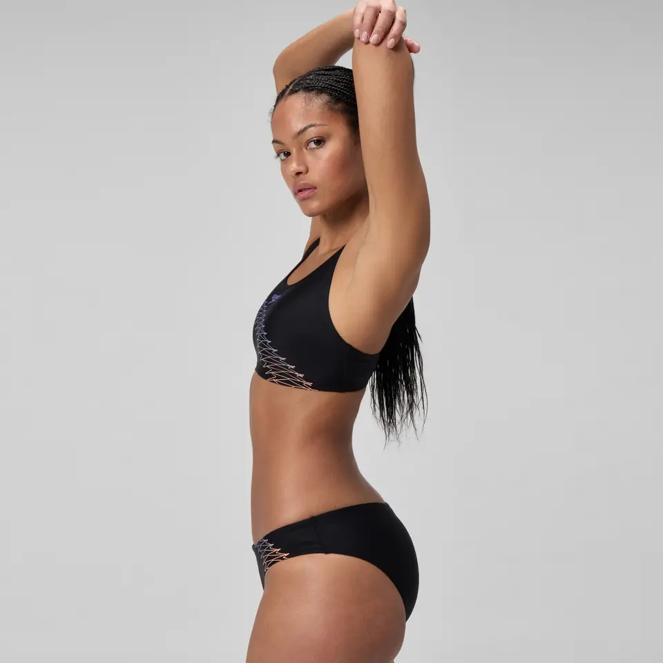 Fitnessziele? Du erreichst sie in unserem sportlichen schwarzen Bikini mit dezenter Boom-Logografik. Das Racerback-Design unterstützt die volle Beweglichkeit der Schulter, sodass du das Tempo weite...