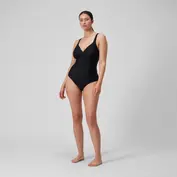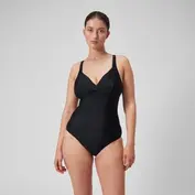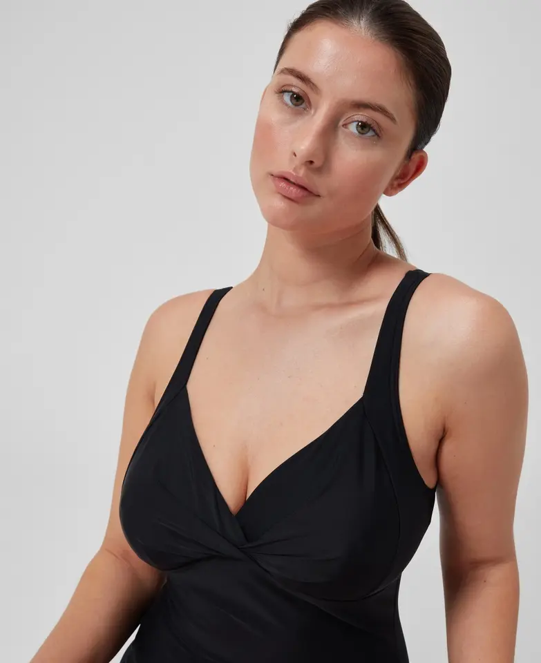 Genieße ein fantastisches Aussehen und Gefühl im Wasser. Dieser zeitlose schwarze Badeanzug wurde von unserem beliebten Modell Brigitte inspiriert, mit Herzausschnitt und eleganten Details an der Brust. Der integrierte stützende Mesh-Einsatz am Bauch schmeichelt deiner Figur und verleiht dir mehr Selbstvertrauen am Pool oder Strand. Verstellbare Träger sorgen für eine verbesserte Passform, während herausnehmbare Doppel-BH-Pads Formgebung und Unterstützung bieten. Unser EnduraFlex Material ist ideal für regelmäßiges Schwimmen. Es bietet eine höhere Chlorbeständigkeit als herkömmliche Badebekleidung und sitzt dank CREORA® HighClo™ länger wie neu. Darüber hinaus werden Nylongarne im EnduraFlex-Gewebe zu 100 % aus Abfällen hergestellt, wie zum Beispiel aus Abfälle aus Fabriken.