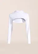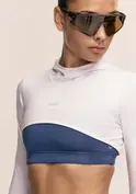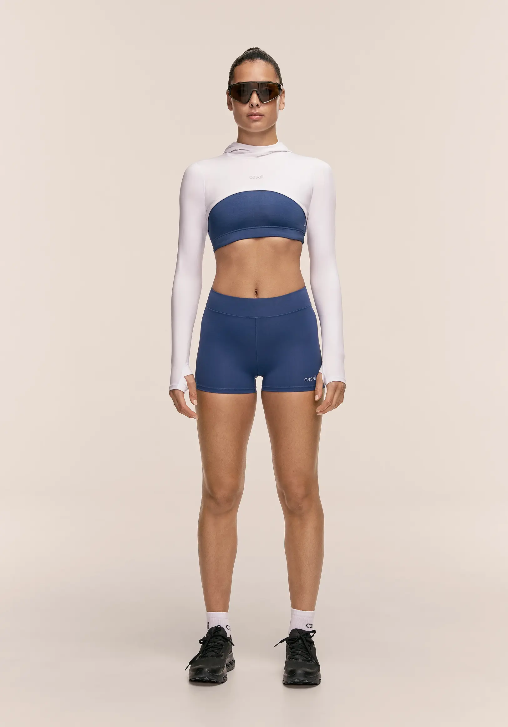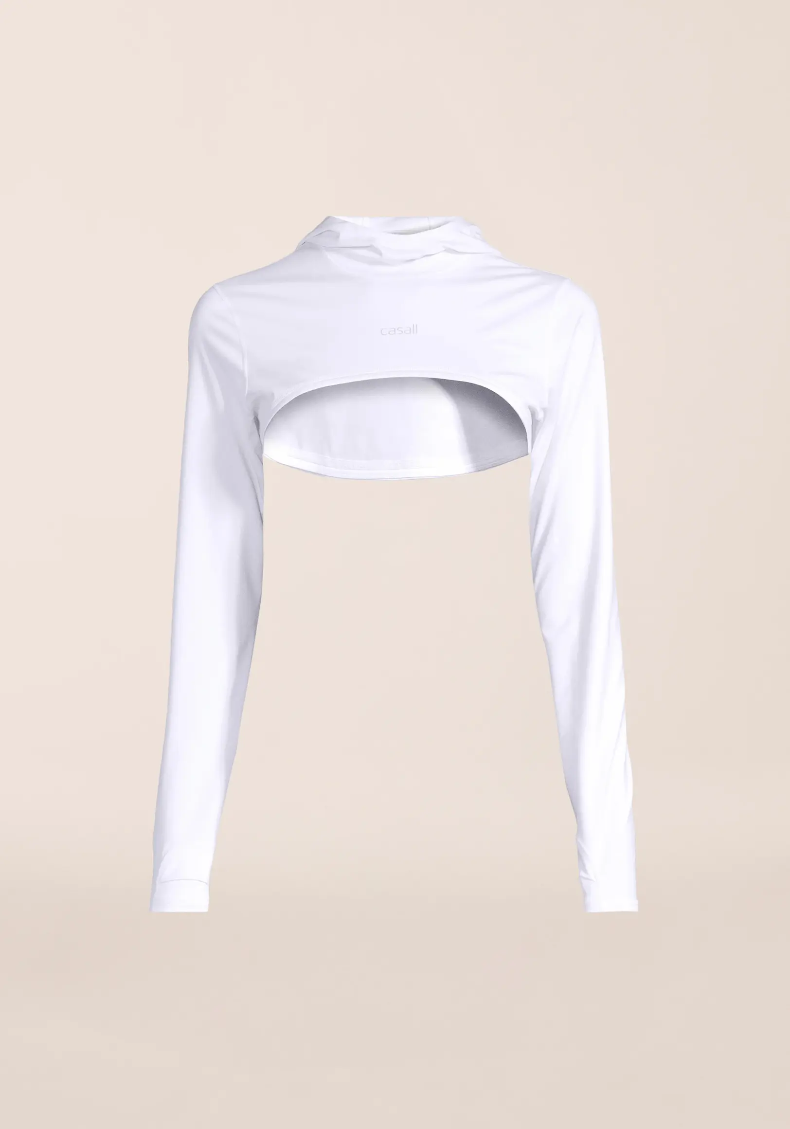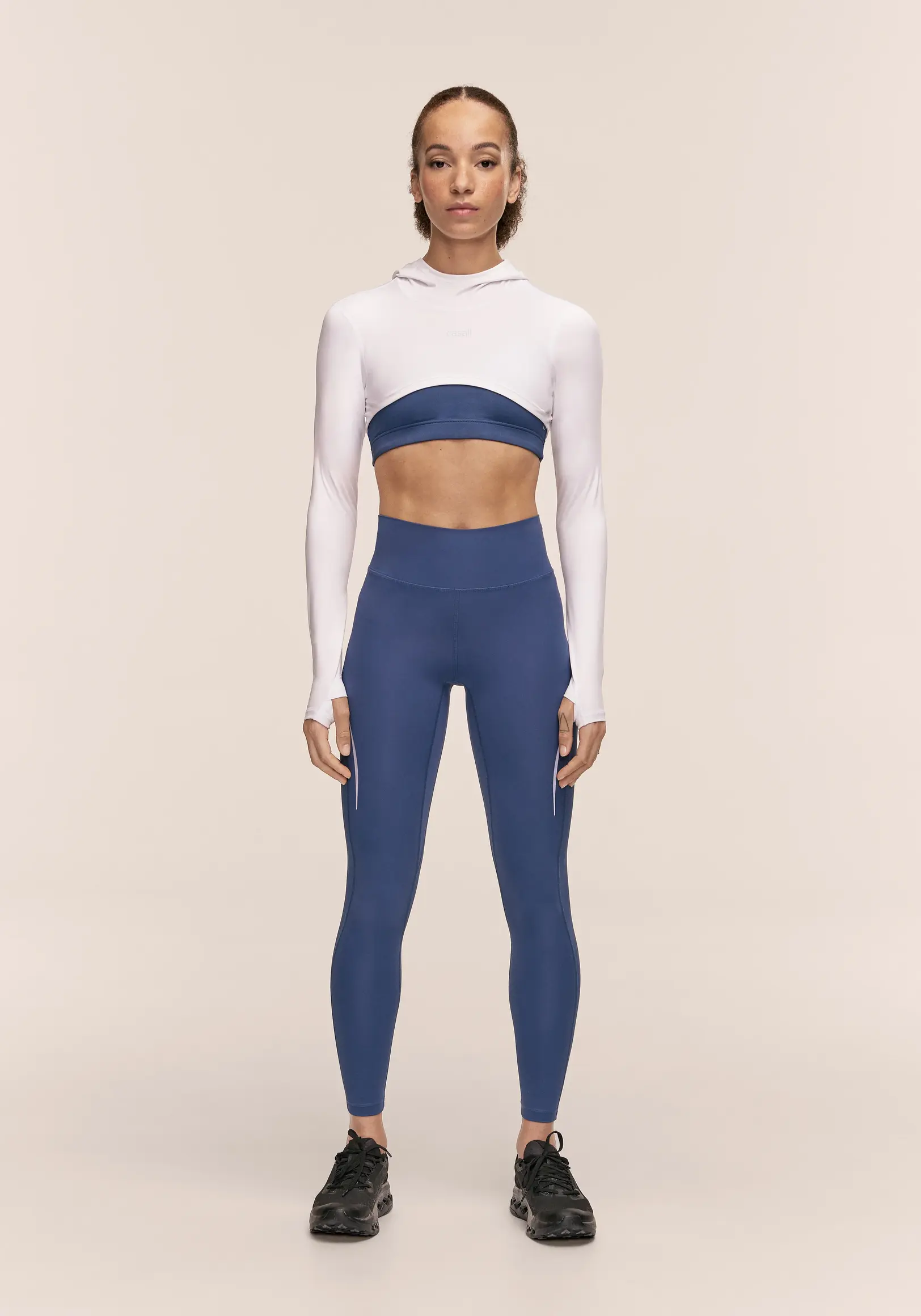 Cropped Trainingshoodie mit schmaler Kapuze und praktischer Öffnung hinten für deinen Pferdeschwanz. Hergestellt aus recyceltem Material mit matter Oberfläche. Entwickelt für intensive Trainingseinheiten. Mit Daumenlöchern an den Ärmelenden.