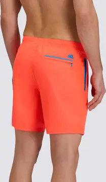 Men's long swim shorts with elasticated waist and side piping, made from lightweight Repreve® recycled polyester. The model features a drawstring for adjusting the fit and a back pocket with zip closure. Outside leg length 16"/41 cm (in size M).