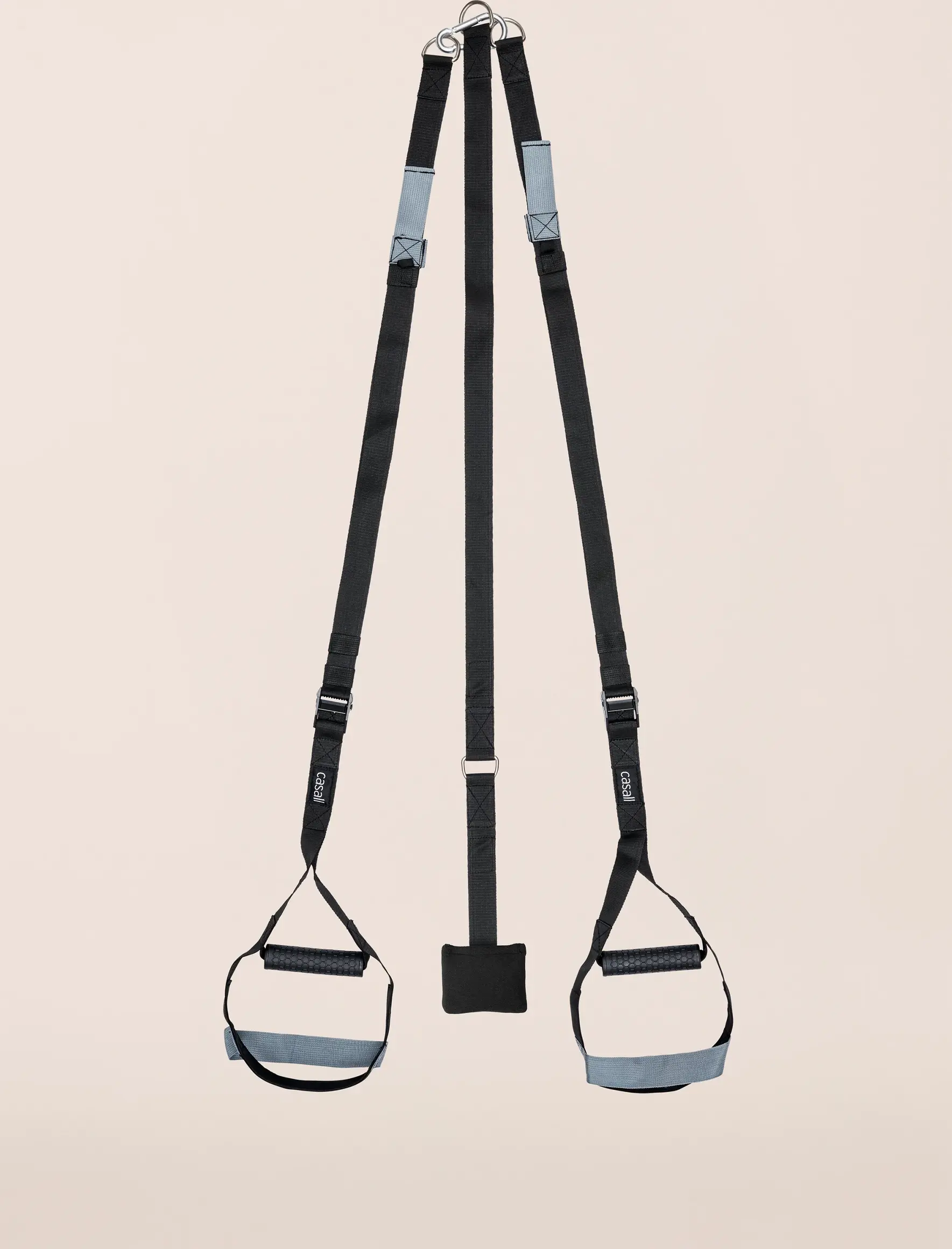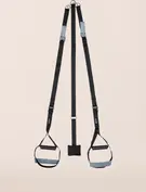 Ganzkörpertraining. Suchen Sie eine Stange, die mindestens 190 cm über dem Boden (oder der Tür) liegt. Stellen Sie sicher, dass sie Ihr Gewicht tragen kann. Befestigen Sie den Multi-Balance-Trainer, indem Sie das Endseil zweimal um die Stange schlingen und es mit einem Stahlclip schließen. Passen Sie die Länge an die Übungen an.