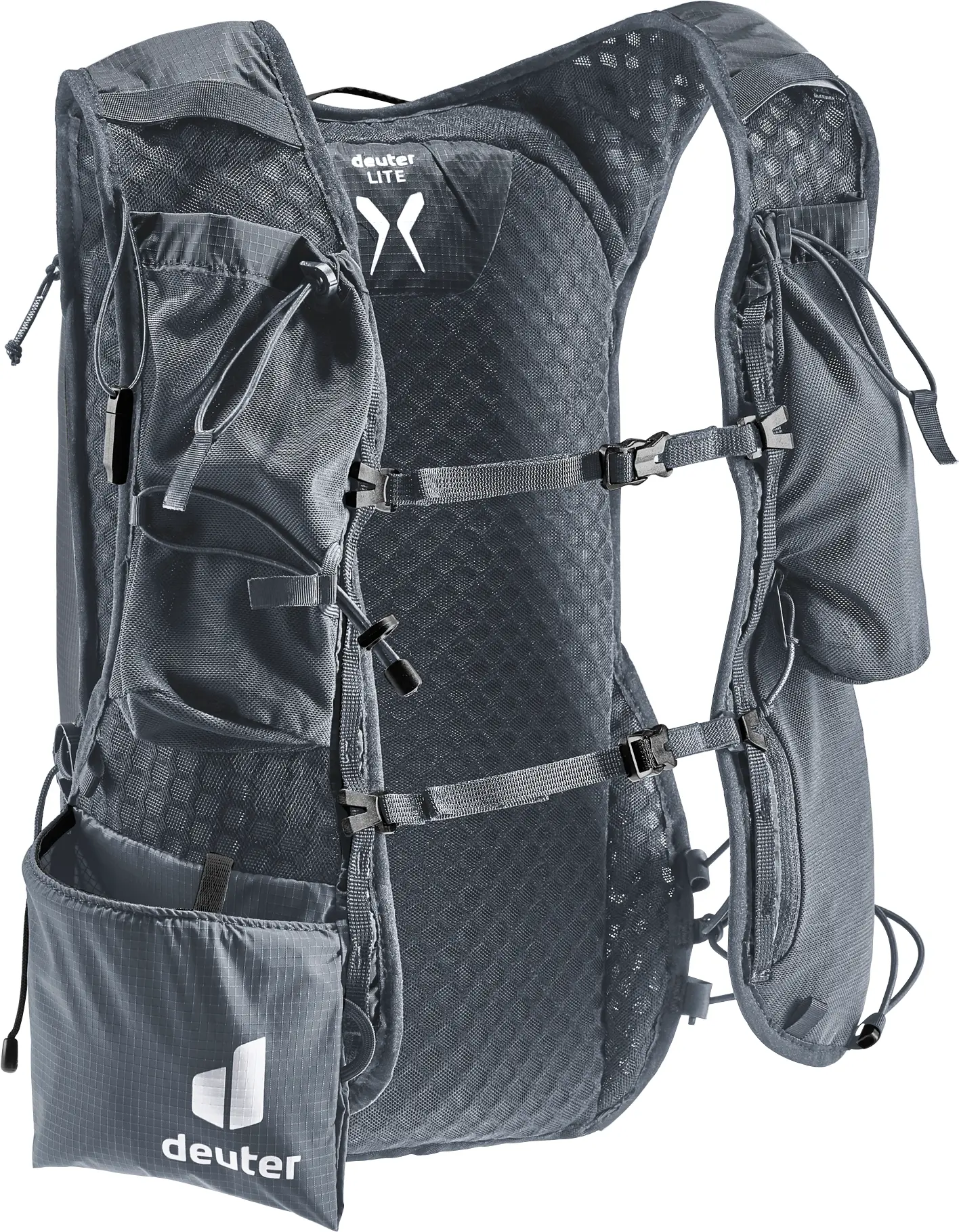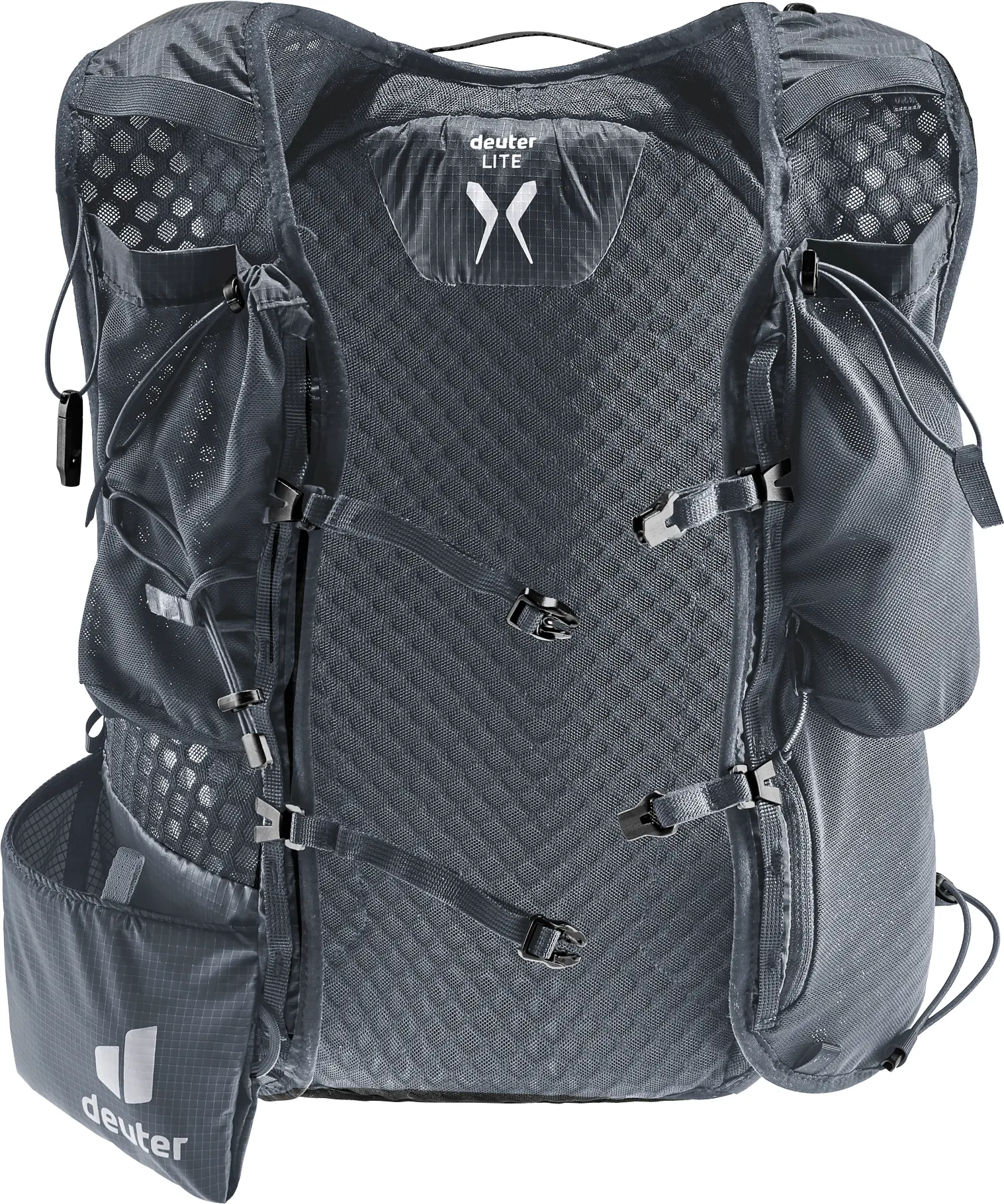 Leichtgewicht mit Komfort: ergonomische, westenförmige Schulterträger mit elastischem Kompressionsgurt, verstellbare Brustgurte und ein weiches Rückenmaterial lassen den Rucksack eng am Oberkörper anliegen. Zudem sorgen die Netzinnentasche und seitlichen Kompressionsriemen für eine Minimierung der Auf- und Abbewegung der Ladung beim Laufen. Die Holster-Stockhalterung am Schultergurt bietet schnellen Zugriff auf die Stöcke. Auch Softflask und GPS sind in den Taschen der Schulterträger stets griffbereit. Das Hauptmaterial des Trailrunnig-Rucksacks ist zu 100% recycelt und bluesign® zertifiziert.
