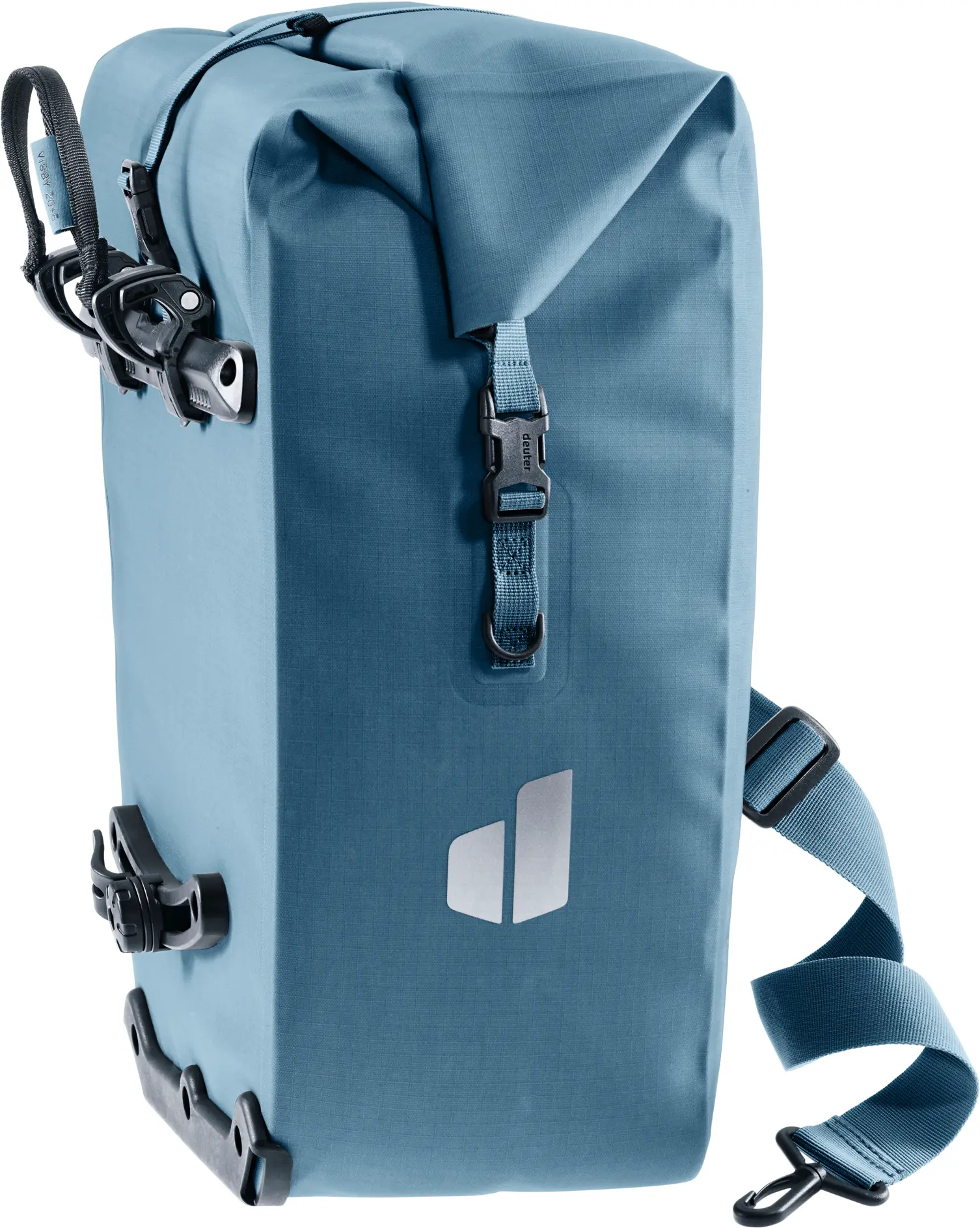 Die multifunktionale Fahrradtasche findet ihren Einsatz als Gepäcktasche am Hinterrad oder als Schultertasche im alltäglichen Gebrauch. Das wasserdichte Material bietet zuverlässigen Schutz vor dem Eindringen von Nässe. Die optimierte BagFix-Halterung sorgt dank leicht bedienbarer Führungsschienen, Haken und Distanzstücken für stabilen Halt und schnelles Abnehmen der Tasche vom Gepäckträger. Die geräumige 20 Liter Roll-Top-Tasche lässt sich um zusätzliche 5 Liter Stauraum erweitern.